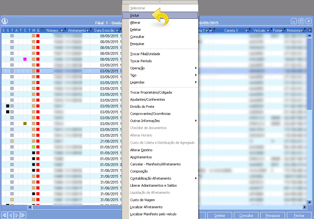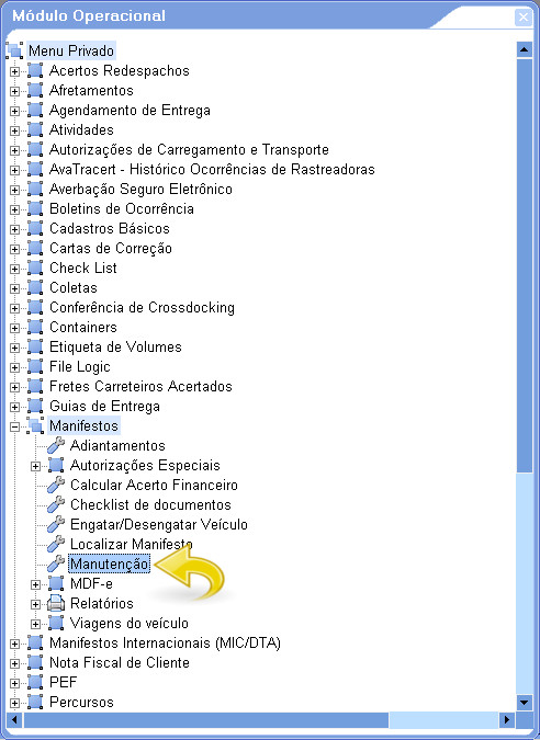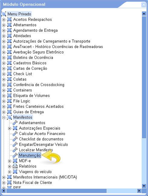 4. Para efetuar um Manifesto de Transferência, acesse: Módulo Operacional/ Menu Privado/ Manifestos/ Manutenção.