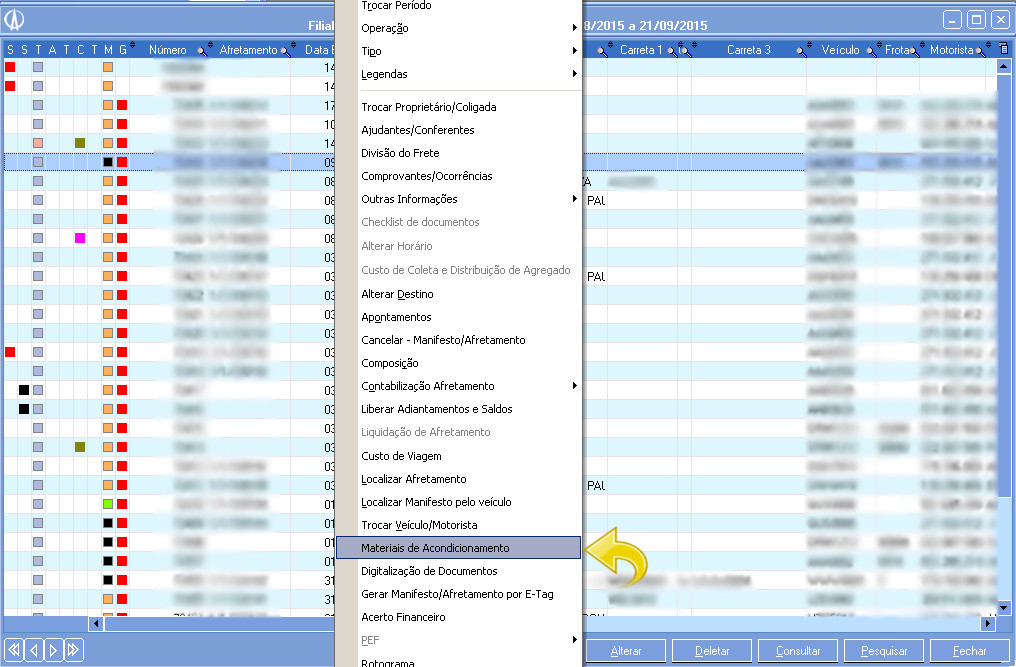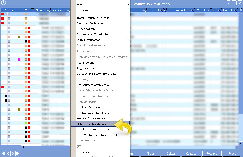 5. Se, nos parâmetros da Empresa, o controle de Material de Acondicionamento for por Cadastro de Produto e não possuir movimento automático, devemos incluir os materiais da seguinte maneira, clique com o botão direito do mouse na tela Manifestos e acesse Materiais de Acondicionamento.