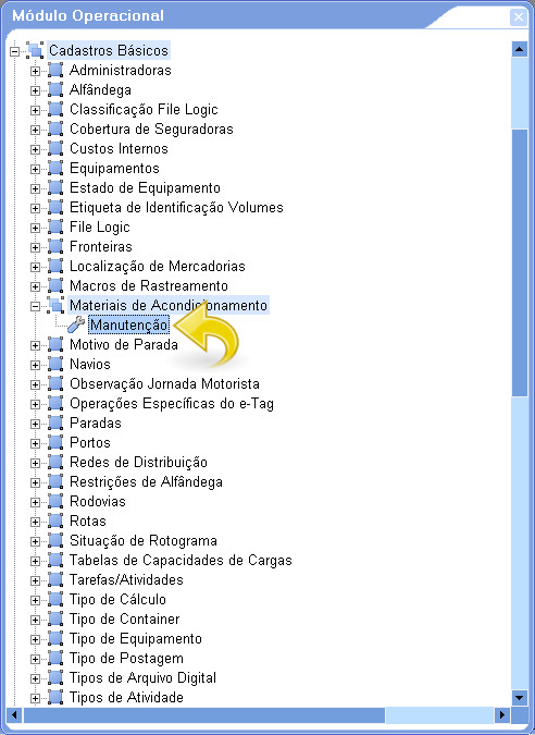 1. Para definir como será feito o controle de Materiais de Acondicionamento, acesse: Módulo Operacional/ Manifestos/ Manutenção.