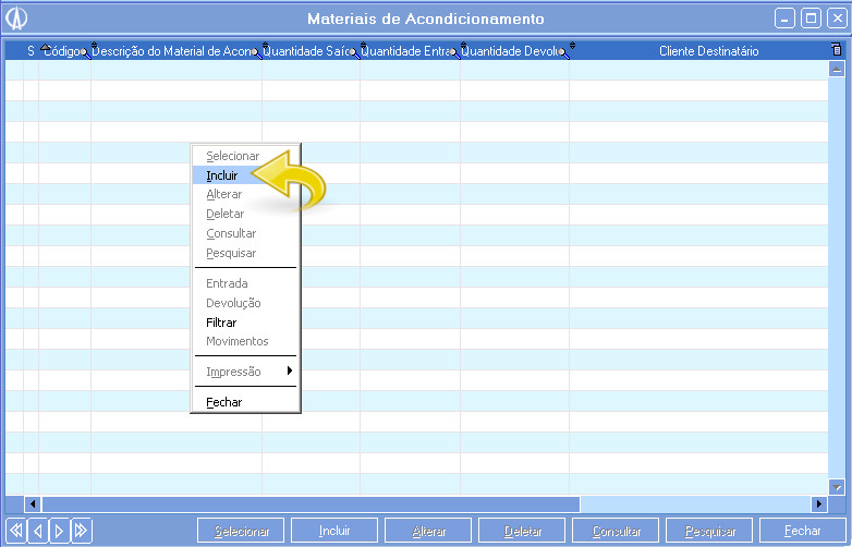 3.1. Será aberta a tela de Materiais de Acondicionamento, clique com o botão direito do mouse e acesse Incluir.