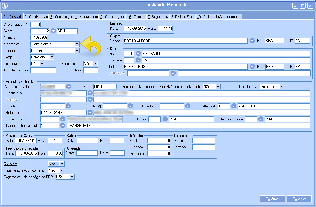 4.2. É necessário alterar dois campos, na Aba 1 – Principal, no campo Manifesto altere para Transferência. O restante preencha normalmente.