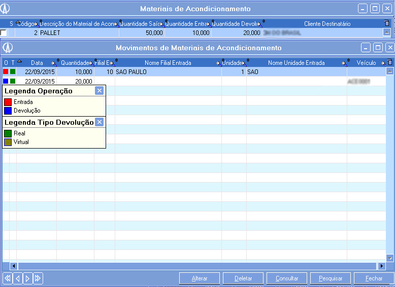 4.4. Após a impressão do Manifesto, haverá a movimentação do material para a filial de destino, ficando registrada a movimentação na tela de material de acondicionamento. No estoque do produto, podemos verificar a movimentação da quantidade do produto e a movimentação registrada no Kardex.