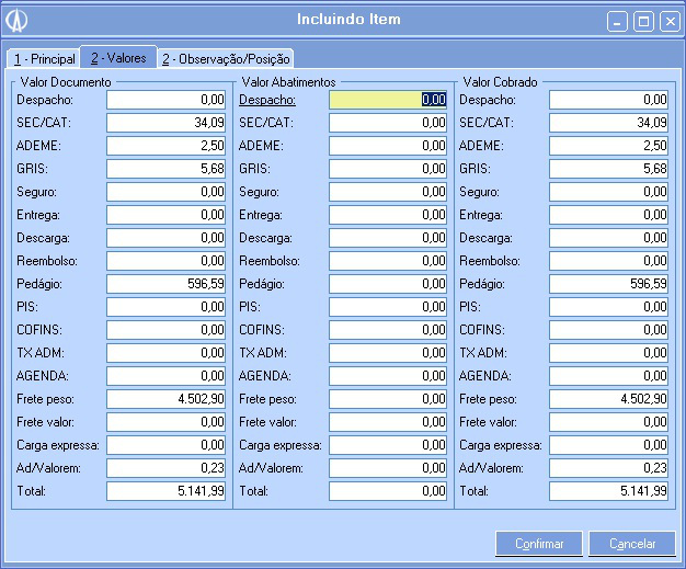 4.2. Na aba 2-Valores é possível verificar o valor do documento, informar valores para abatimento e verificar o valor a ser cobrado.