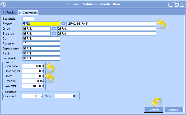 5. Para incluir o item, informe o código do produto ou clique duas vezes no campo para selecionar um. Informe quantidade e o valor do produto, neste exemplo utilizamos 10 abraçadeiras no valor de R$10,00, totalizando um total de R$ 100,00. Após isso confirme.