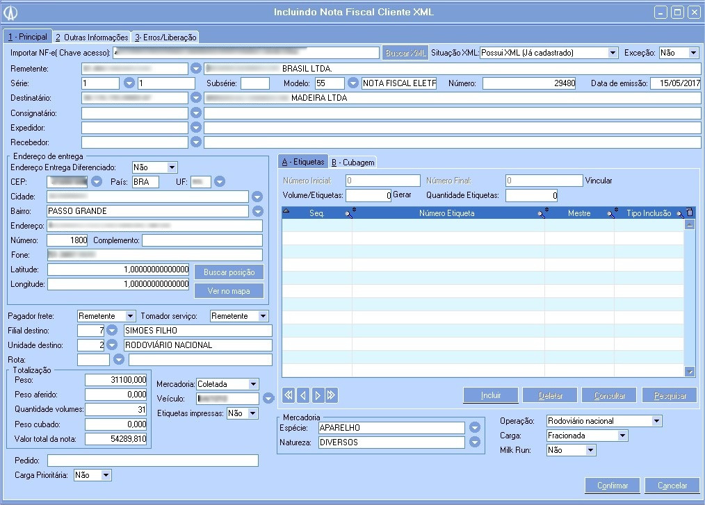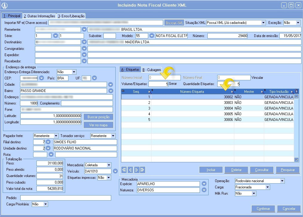 1.2.1 Para incluir as etiquetas, no campo Volume/Etiquetas, informe o número de etiquetas que deverá ser gerado. Após a conferir todos os dados clique no botão Confirmar para terminar de fazer a inclusão da nota.