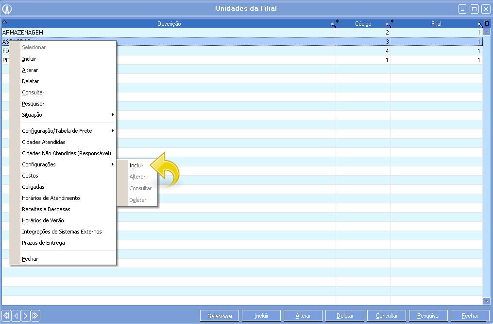 1.9. A tela "Unidades da Filial" será exibida, clique com o botão direito do mouse sobre o registro e selecione a opção Configurações/ Incluir.