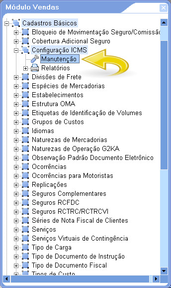 3. Para Configurar o ICMS (Estado de Origem X Destino Informado), acesse: Módulo Vendas/ Cadastro Básicos/ Configuração ICMS/ Manutenção.