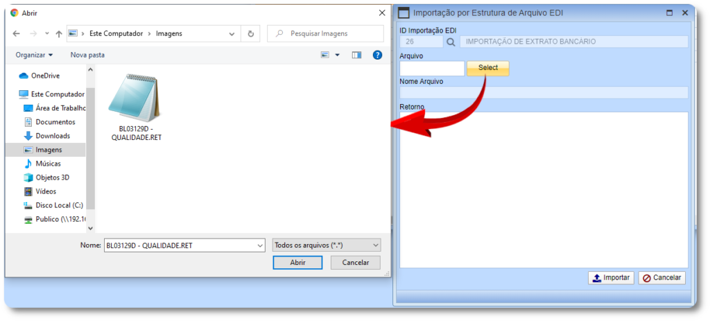 2.2 Ao apresentar a tela “Importação por Estrutura de Arquivo EDI” pressione o botão Select e escolha o arquivo de importação, de acordo com o tipo de importação selecionado anteriormente.