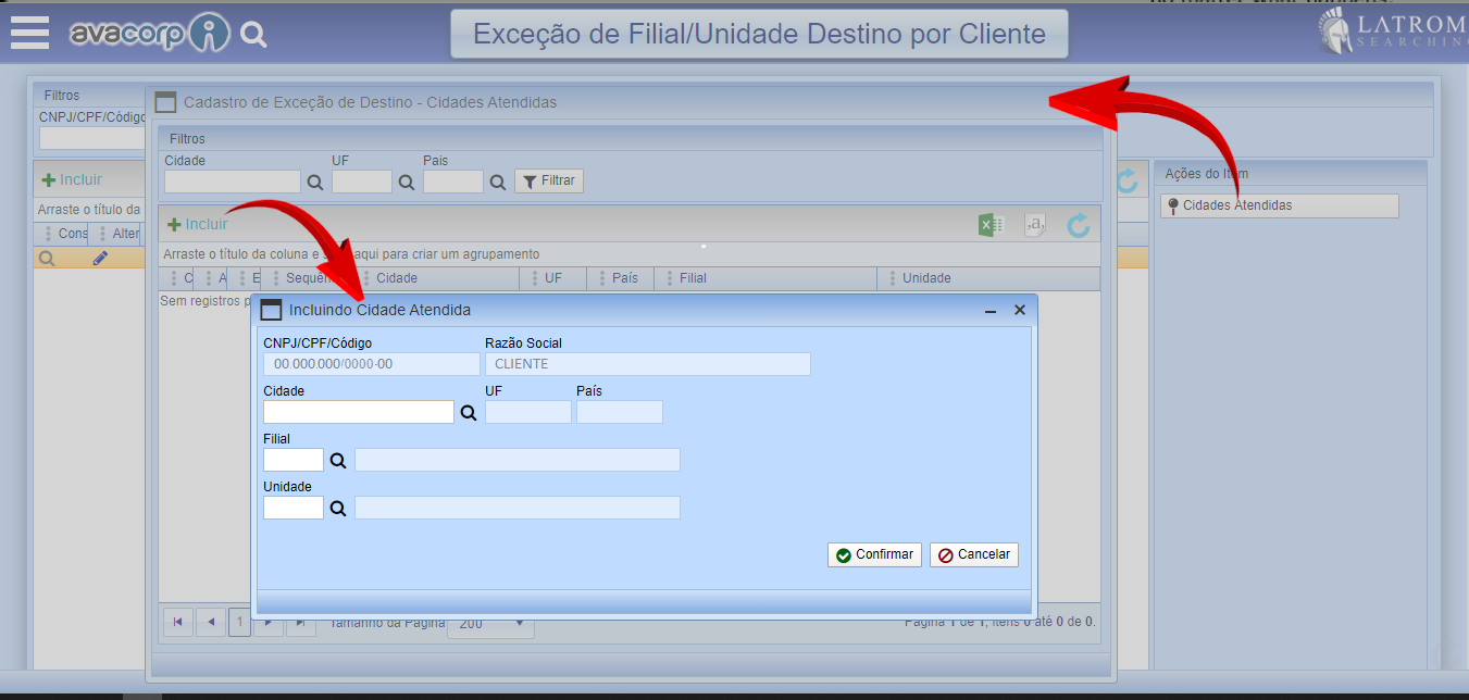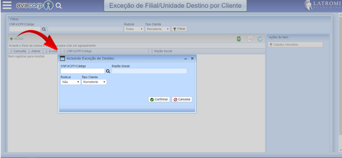 1. Acesse o caminho Avacorp I – Cadastro – Parâmetros – Exceção de Filial/Unidade Destino por Cliente