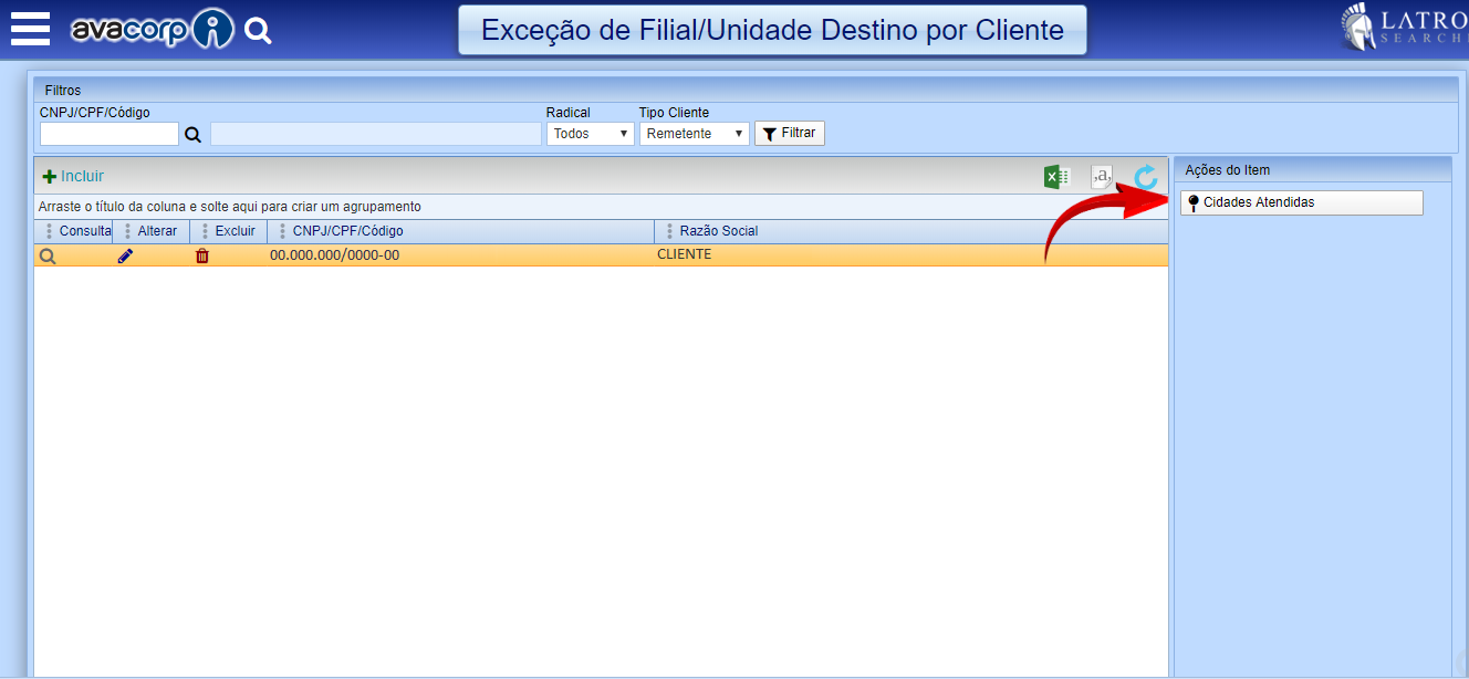 4. Selecione um registro e clique na ação “Cidades Atendidas”.