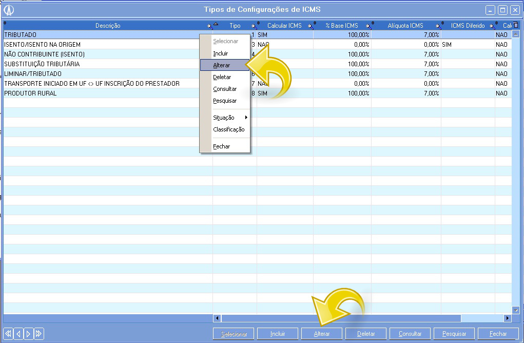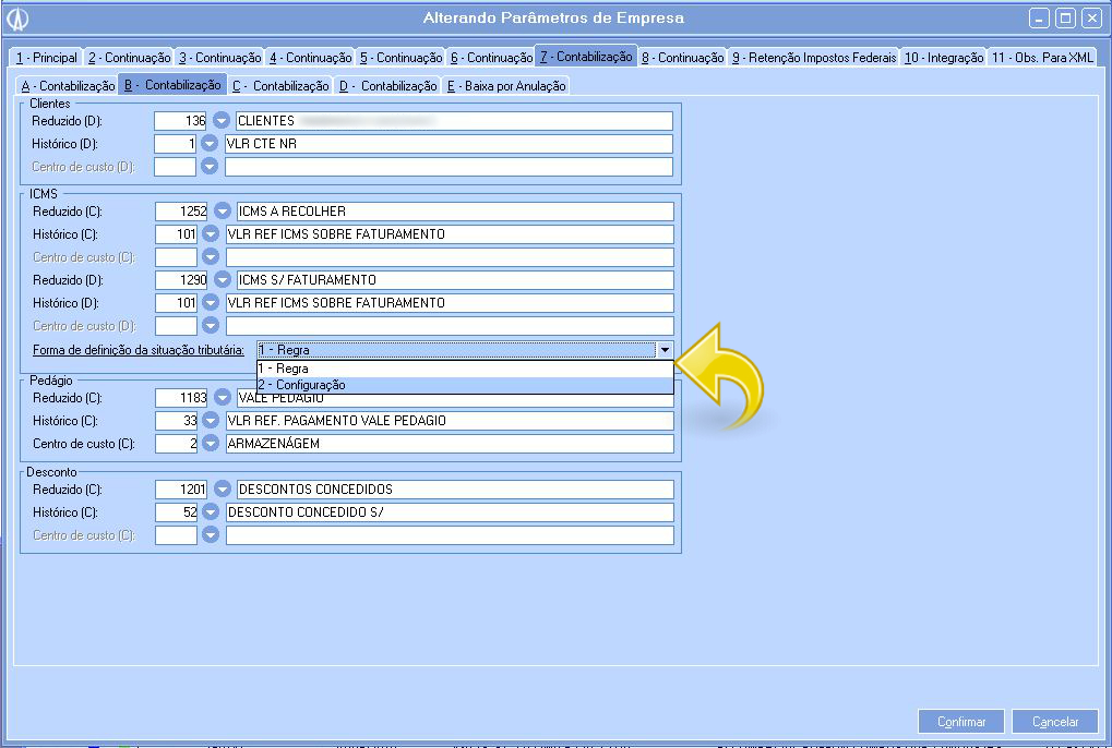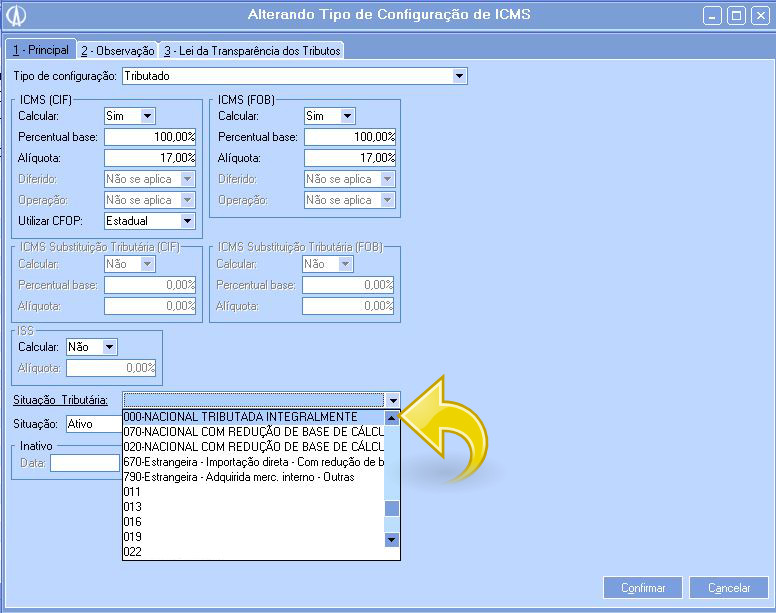 3.5. Vá até a aba 3 Configurações Cálculo/Valores e em seguida na aba E-Impostos ICMS e observe que 0 campo Situação tributária foi preenchido com as dados configurados anteriormente.