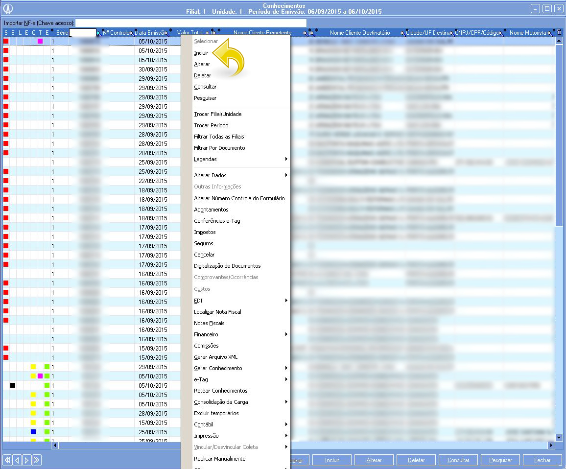3.2. Ao abrir a tela Conhecimentos, clique com o botão direito e selecione a opção Incluir ou clique no botão Incluir na parte inferior da tela: