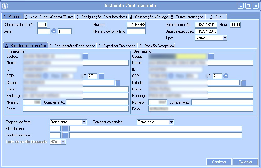 Os campos Remetente e Destinatário devem ser os mesmo cadastrados anteriormente nas Configurações de ICMS.