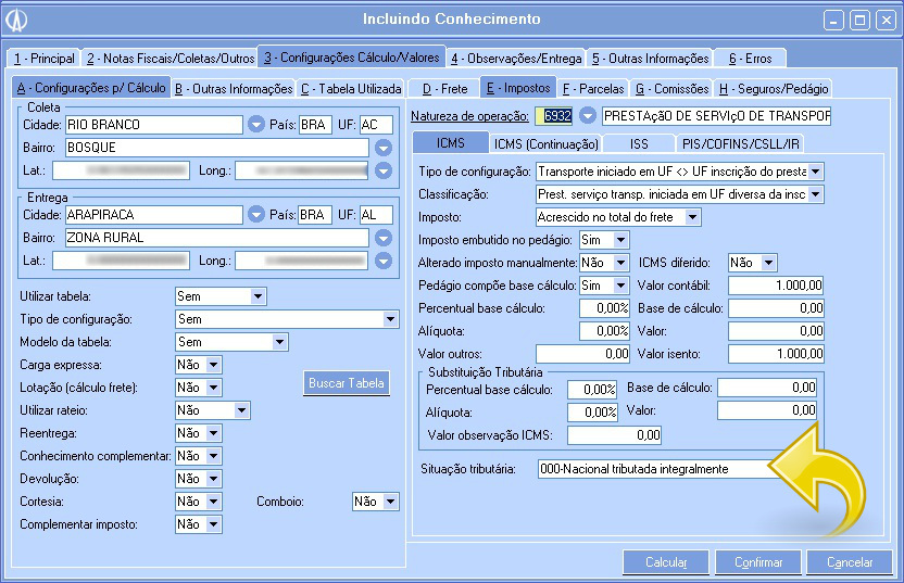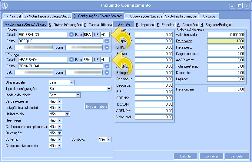 3.4. Após inserir as informações necessárias, vá até a aba 3 Configurações Cálculo/Valores e efetue o cálculo do frete clicando no botão Calcular localizado na parte inferior da tela: