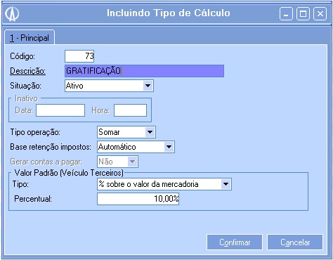 1.2. A tela de inclusão de tipo de calculo será exibida. Preencha os campos necessários e clique em Confirmar.