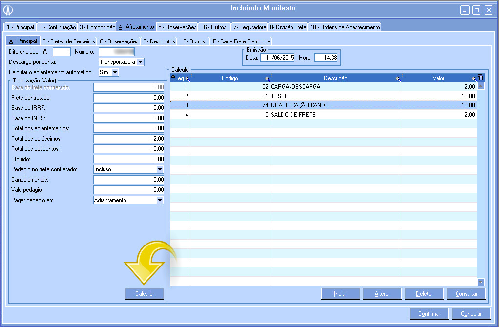 2.2. Na aba de afretamento clique no botão Calcular. Os tipo de cálculos serão calculados e exibidos na grade ao lado.