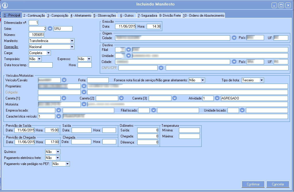 2.1. A tela de manutenção de manifesto será exibida. Inclua um manifesto com veiculo terceiro, preencha os campos necessários e a aba de afretamento será exibida.