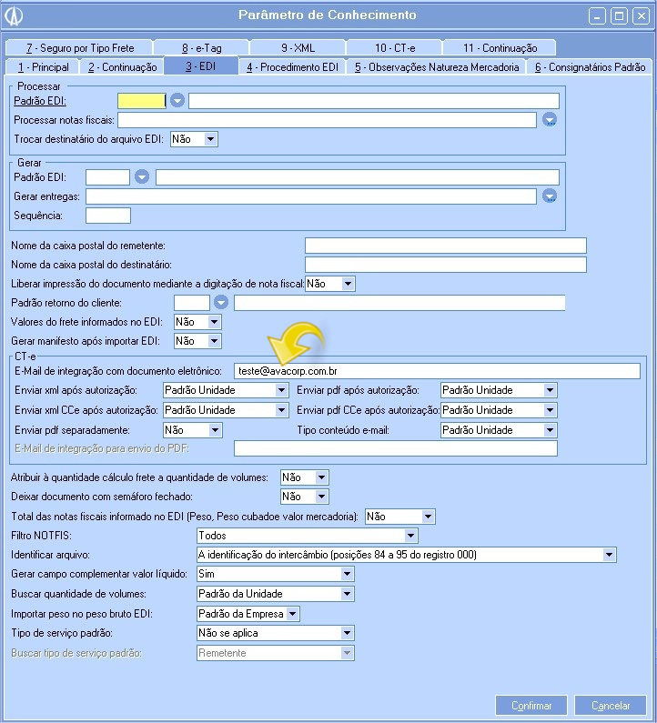 1.6. Na tela Parâmetro de Conhecimento vá até a aba 3-EDI. Nesta tela, no campo E-Mail de integração com documento eletrônico insira o e-mail e confirme a alteração.