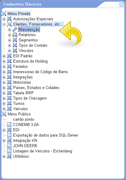 1. Acesse o módulo Cadastros Básicos selecionando Clientes, Fornecedores, etc…/Manutenção: