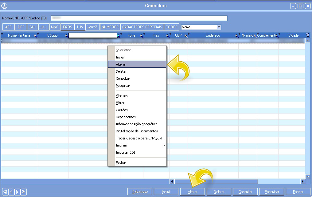 1.1. Ao abrir a tela Cadastros selecione o cliente que será o pagador do frete na emissão do conhecimento e clique com o botão direito e selecionando a opção Alterar ou então clique no botão Alterar na parte inferior da tela: