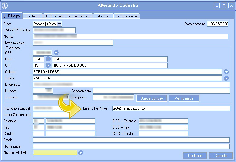 1.2. Na tela Alterando Cadastro preencha o campo Email CT-e/NF-e com o endereço de e-mail que receberá o e-mail de cancelamento e confirme a alteração do cadastro clicando no botão Confirmar na parte inferior da tela: