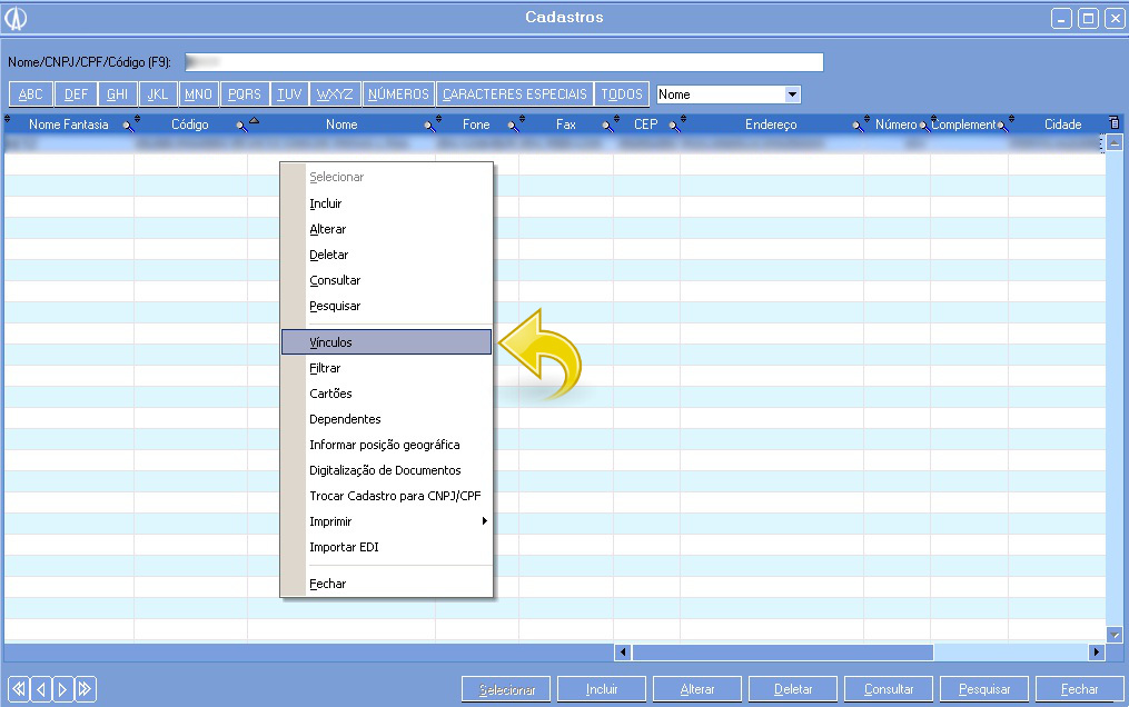 1.3. O sistema retornará para a tela Cadastros. Selecione novamente o cliente pagador do frete do conhecimento e clique com o botão direito em Vínculos: