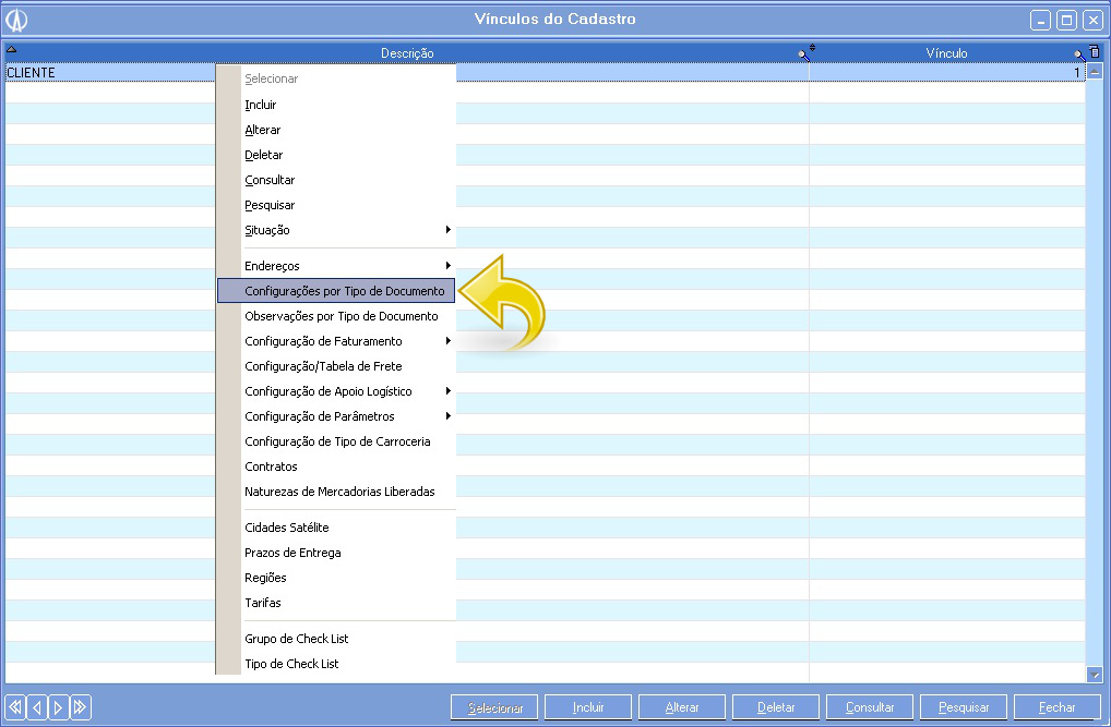 1.4. Na tela Vínculos do Cadastro selecione a opção Cliente e clique com o botão direito selecionando a opção “Configurações por Tipo de Documento”: