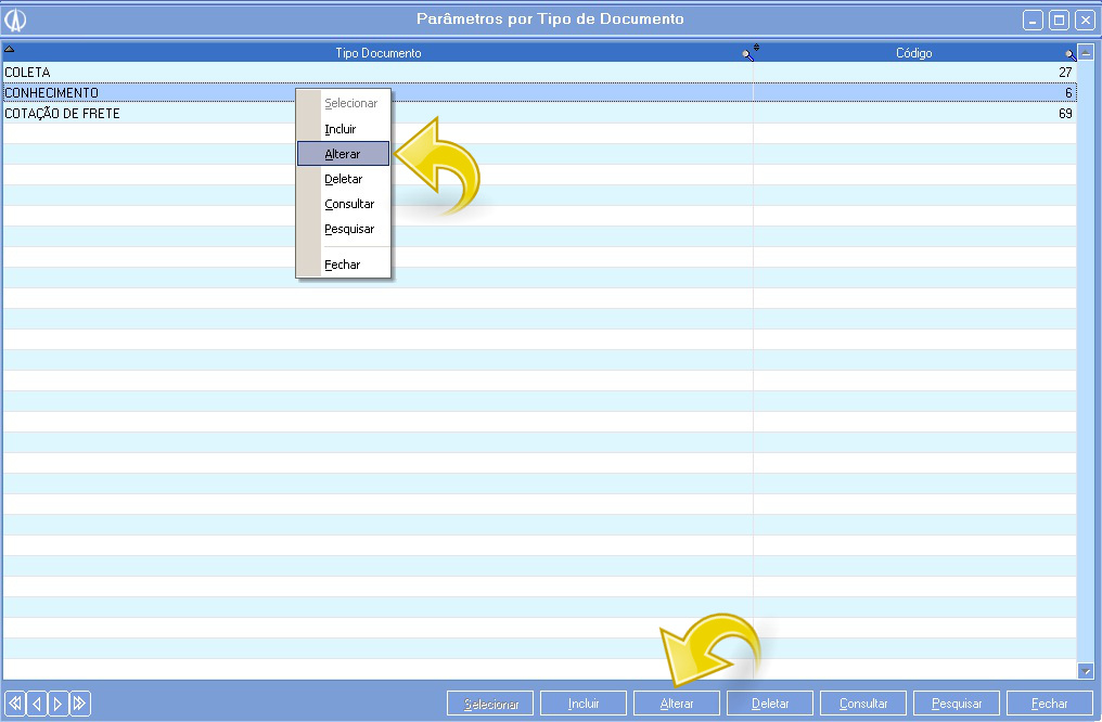 1.5. Na tela Parâmetros por Tipo de Documento selecione a opção Conhecimento e clique com o botão direito selecionando a opção Alterar: