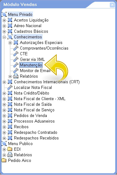 2. Acesse o módulo de Vendas e selecione a opção Conhecimento/Manutenção: