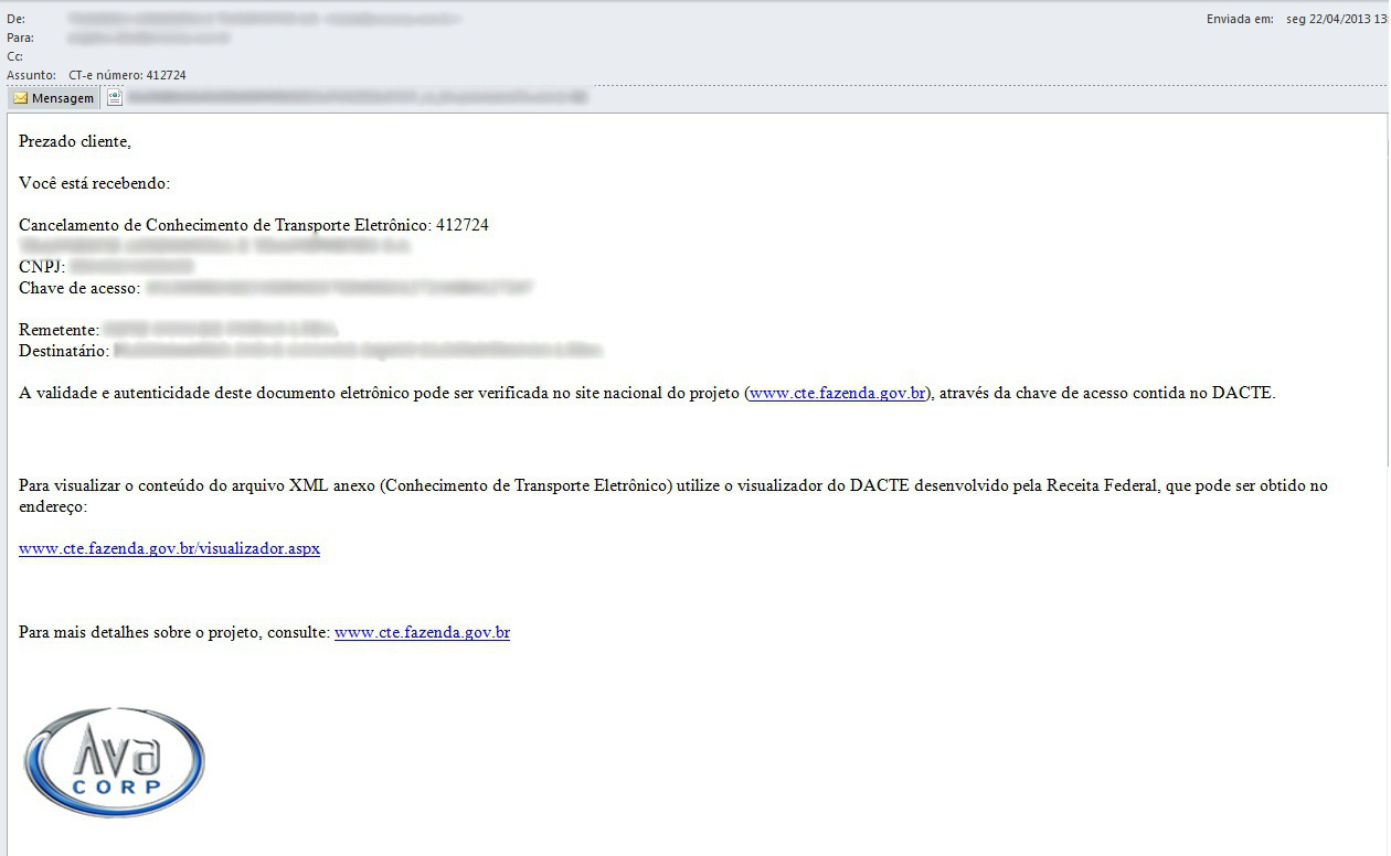 2.3. Após o cancelamento do conhecimento, será enviado um e-mail para o pagador do frete do mesmo. O e-mail serve de confirmação do cancelamento do conhecimento.