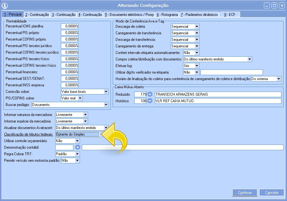 1.4. Quando abrir a tela Configurações, na aba 1- Principal, vá até o campo Classificação de tributos federais e certifique-se que o mesmo esteja configurado com a opção Optante do simples. Se for necessário, altera preenchendo o campo com esta opção: