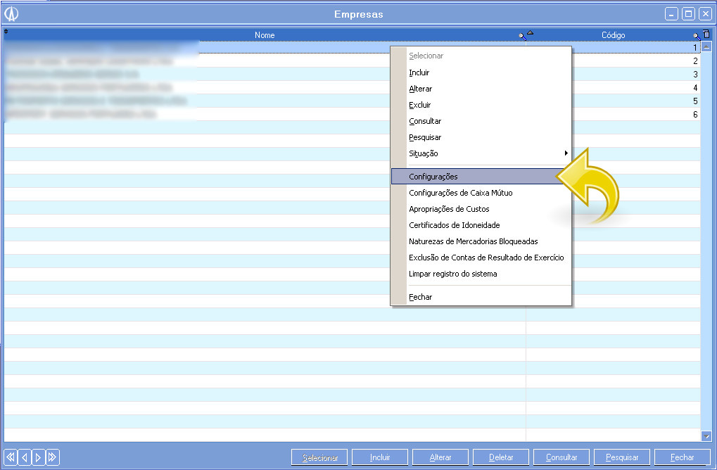 1.1. Ao abrir a tela Empresas, selecione a empresa que vocês está utilizando e clique com o botão direito sobre ela selecionando a opção Configurações:
