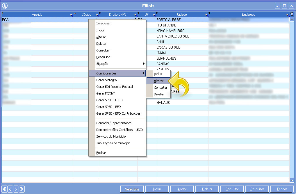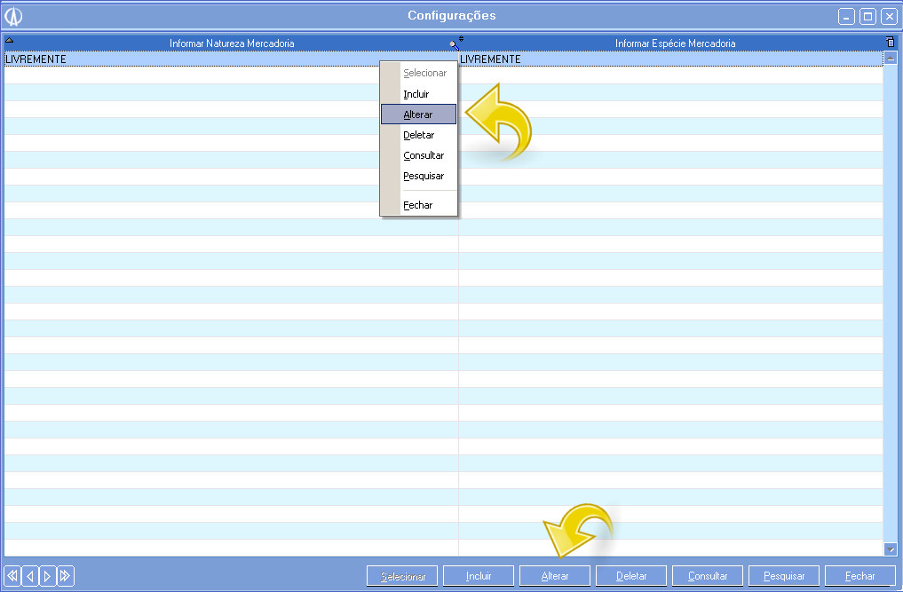 1.2. Na tela seguinte, se já houverem dados cadastrados, clique com o botão direito e selecione Alterar ou clique no botão Alterar na parte inferior da tela. Se ainda não houver nenhuma configuração cadastrada, você pode incluí-la clicando com o botão direito e selecionando a opção Incluir ou clocar no botão Incluir na parte inferior da tela.