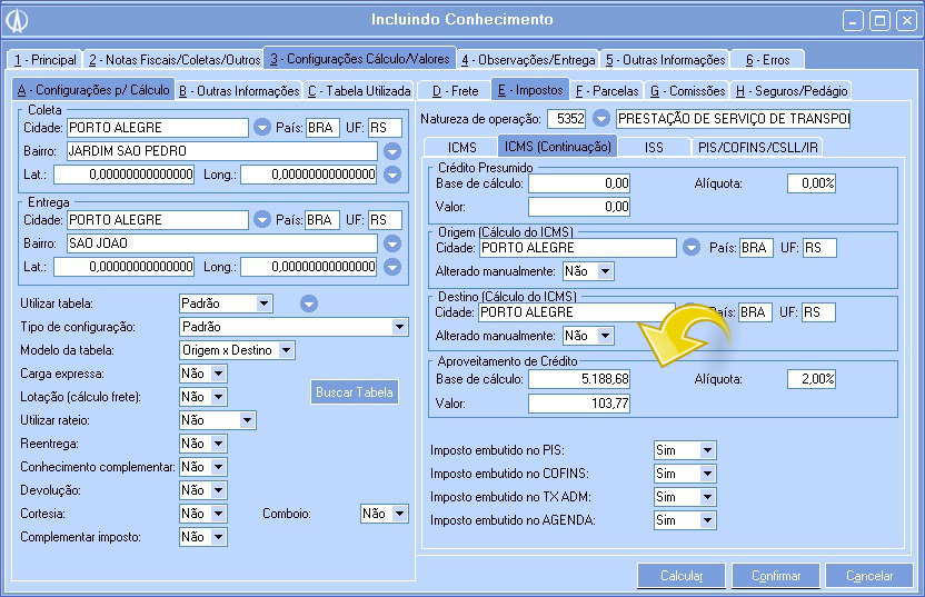 Processo que possibilita que fiquem gravados os dados do aproveitamento de crédito ICMS nos conhecimentos e conhecimentos aéreos.