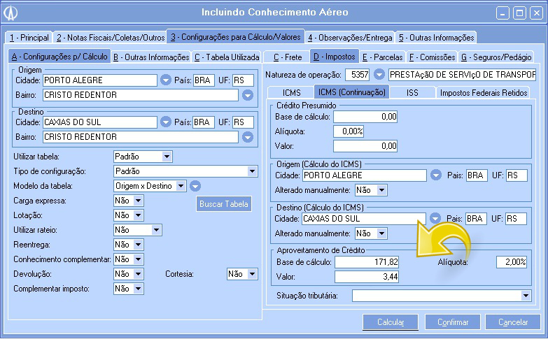 Conhecimento: Conhecimento Aéreo:Para visualizar as informações e os cálculos configurados anteriormente, basta realizar o cálculo na aba 3- Configurações cálculos/valores. Clique no botão Calcular.
